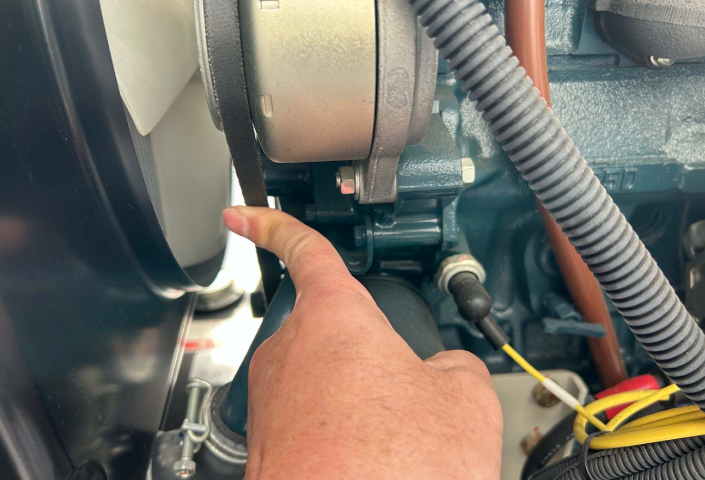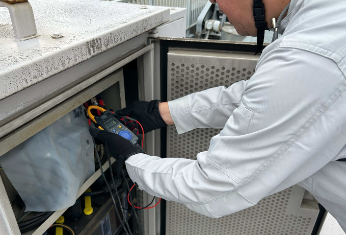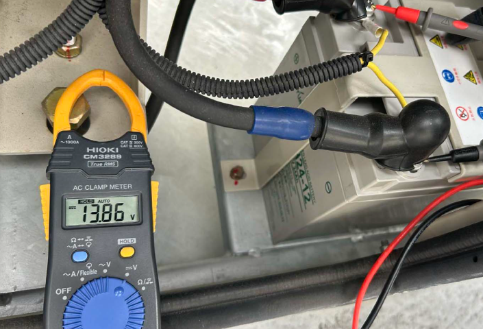 点検の結果、エンジンの稼働時間や各動作においてもすべて正常で、問題なく点検を完了しました。今回は特に、始動用バッテリーについて念入りに確認を行い、発電機本体の計器による測定に加え、クランプメーターを使用して直接電圧を測定することで、より正確な状態確認を実施しています。